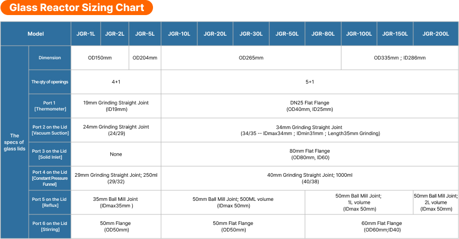 Lab1st 유리반응기 사이즈 차트표