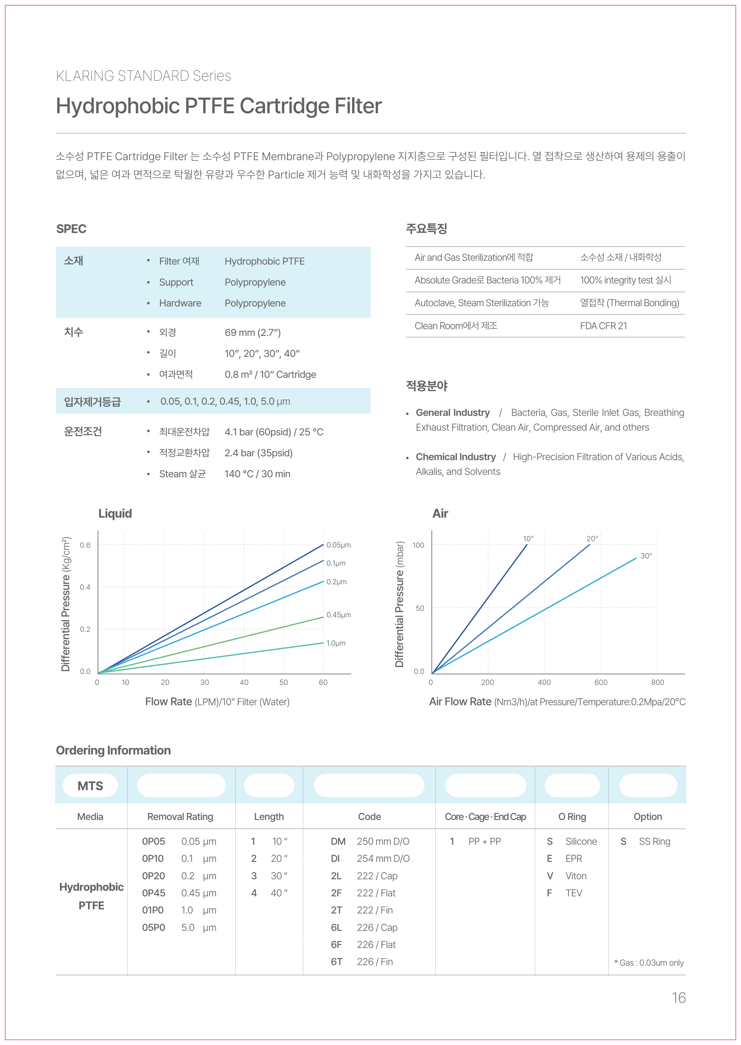 소수성 PTFE Cartridge Filter 는 소수성 PTFE Membrane과 Polypropylene 지지층으로 구성된 필터입니다.