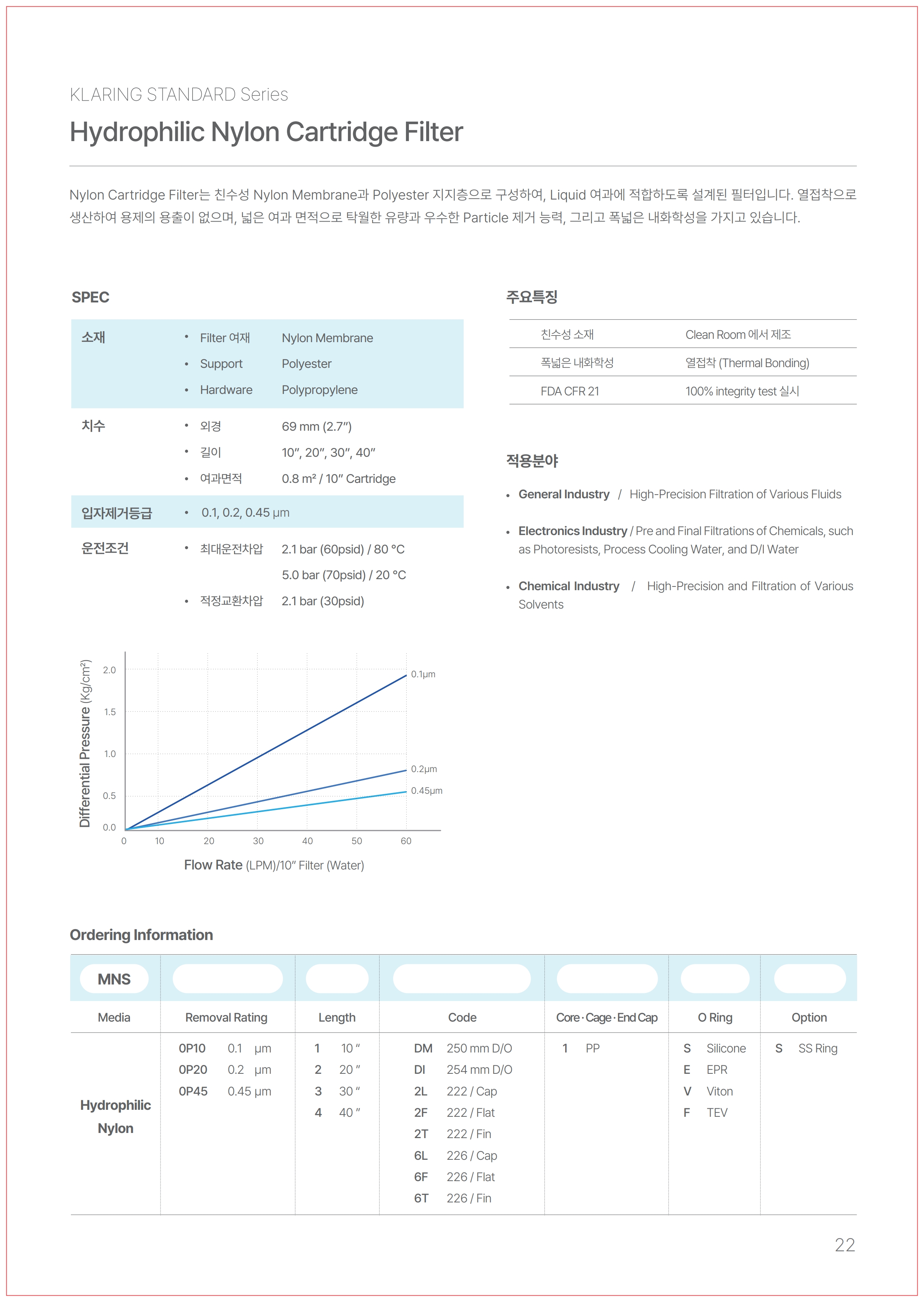 Nylon Cartridge Filter는 친수성 Nylon Membrane과 Polyester 지지층으로 구성하여, Liquid 여과에 적합하도록 설계된 필터입니다. 열접착으로 생산하여 용제의 용출이 없으며, 넓은 여과 면적으로 탁월한 유량과 우수한 Particle 제거 능력, 그리고 폭넓은 내화학성을 가지고 있습니다.