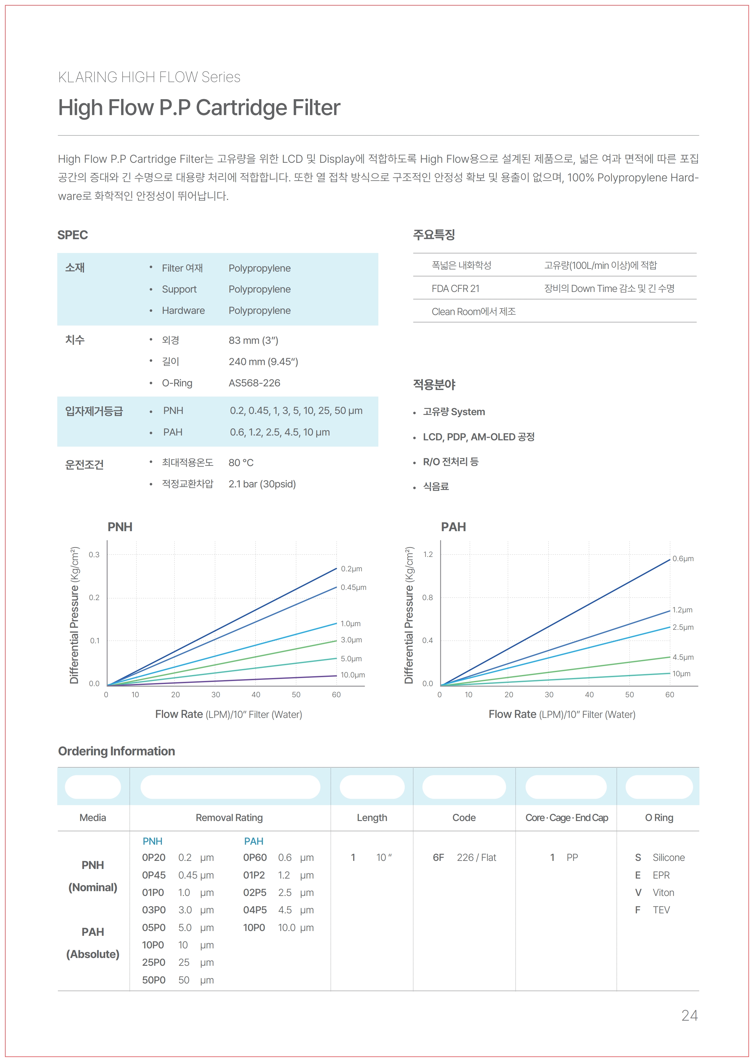High Flow P.P Cartridge Filter는 고유량을 위한 LCD 및 Display에 적합하도록 High Flow용으로 설계된 제품으로, 넓은 여과 면적에 따른 포집 공간의 증대와 긴 수명으로 대용량 처리에 적합합니다. 또한 열 접착 방식으로 구조적인 안정성 확보 및 용출이 없으며, 100% Polypropylene Hard- ware로 화학적인 안정성이 뛰어납니다.