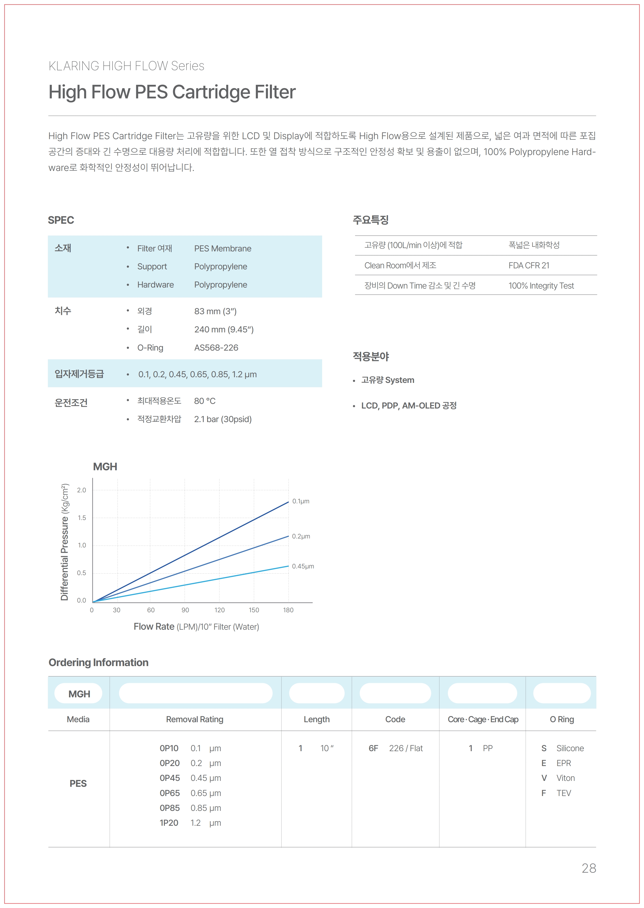 High Flow PES Cartridge Filter는 고유량을 위한 LCD 및 Display에 적합하도록 High Flow용으로 설계된 제품으로, 넓은 여과 면적에 따른 포집 공간의 증대와 긴 수명으로 대용량 처리에 적합합니다. 또한 열 접착 방식으로 구조적인 안정성 확보 및 용출이 없으며, 100% Polypropylene Hard- ware로 화학적인 안정성이 뛰어납니다.
