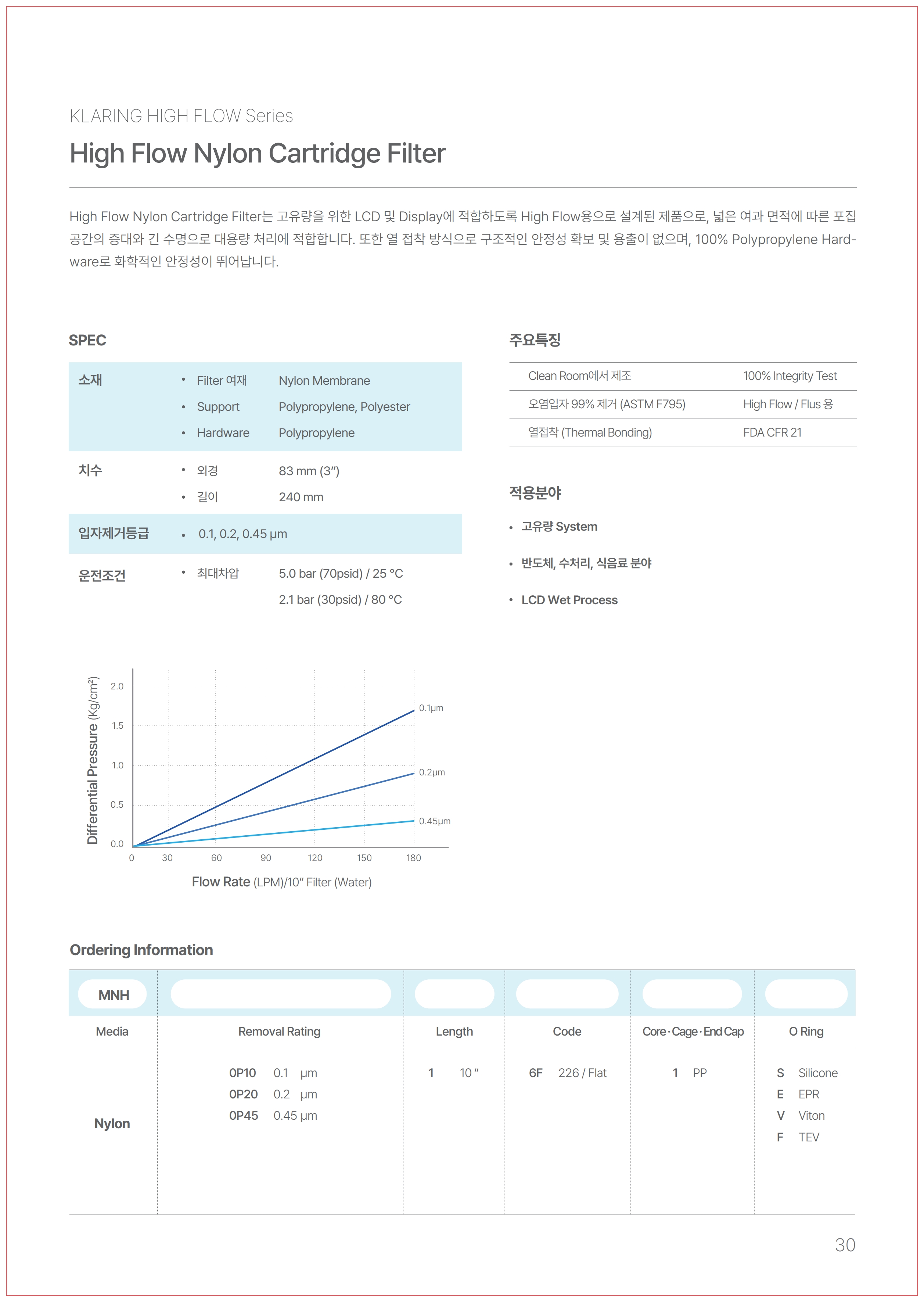 • High Flow Nylon Cartridge Filter는 고유량을 위한 LCD 및 Display에 적합하도록 High Flow용으로 설계된 제품으로, 넓은 여과 면적에 따른 포집 공간의 증대와 긴 수명으로 대용량 처리에 적합합니다. 또한 열 접착 방식으로 구조적인 안정성 확보 및 용출이 없으며, 100% Polypropylene Hard- ware로 화학적인 안정성이 뛰어납니다