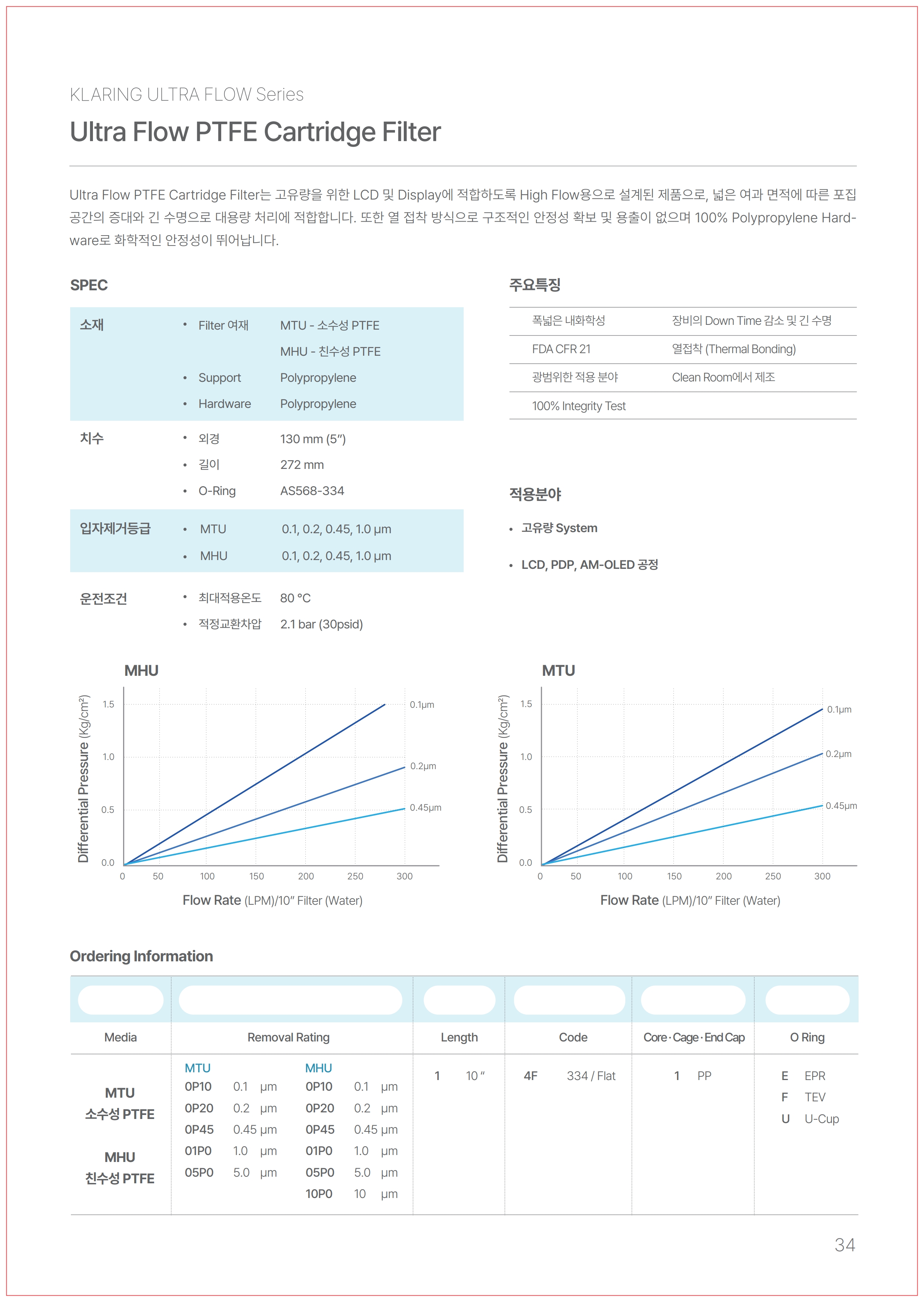 • Ultra Flow PTFE Cartridge Filter는 고유량을 위한 LCD 및 Display에 적합하도록 High Flow용으로 설계된 제품으로, 넓은 여과 면적에 따른 포집 공간의 증대와 긴 수명으로 대용량 처리에 적합합니다. 또한 열 접착 방식으로 구조적인 안정성 확보 및 용출이 없으며 100% Polypropylene Hard- ware로 화학적인 안정성이 뛰어납니다.