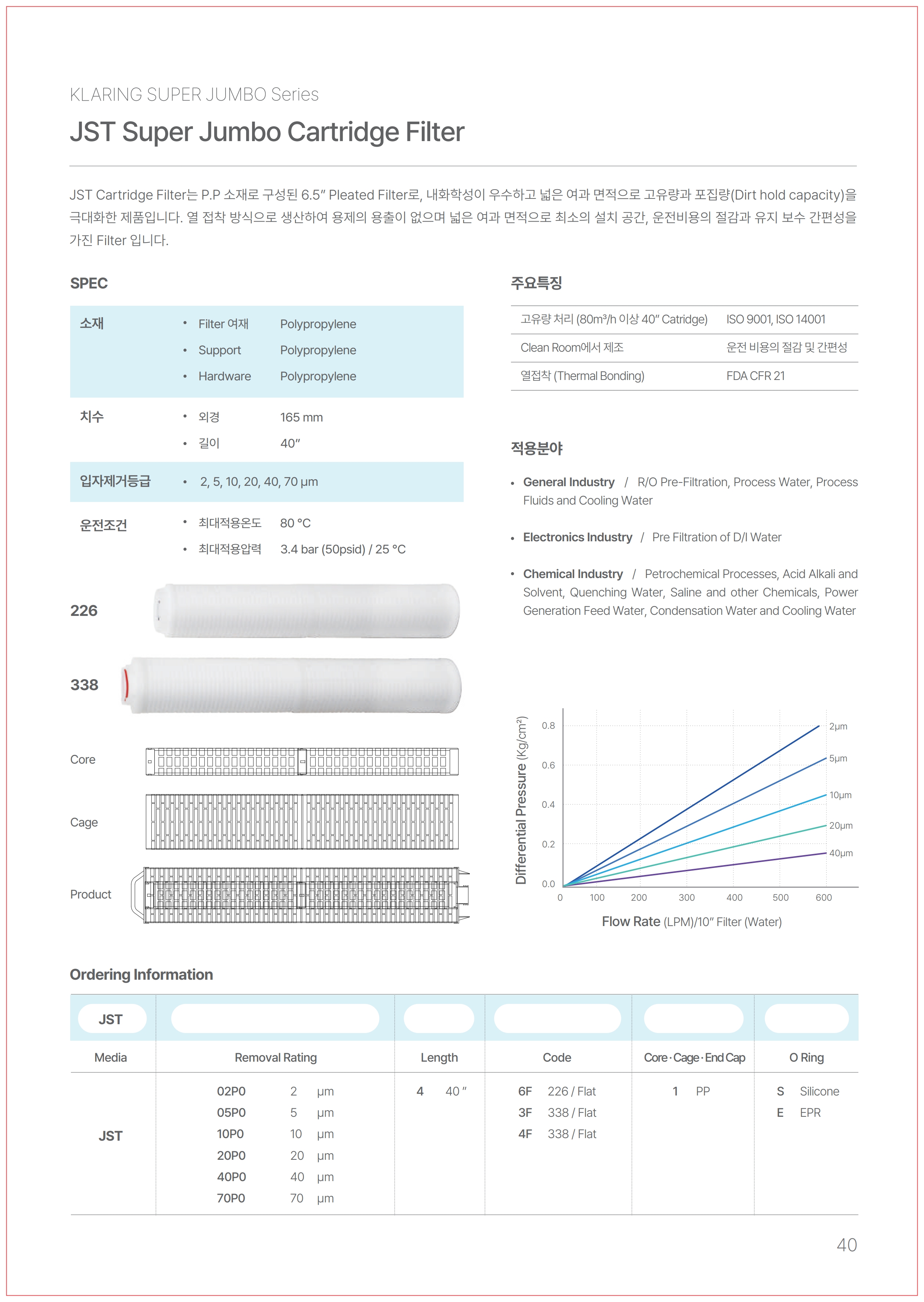 • JST Cartridge Filter는 P.P 소재로 구성된 6.5” Pleated Filter로, 내화학성이 우수하고 넓은 여과 면적으로 고유량과 포집량(Dirt hold capacity)을 극대화한 제품입니다. 열 접착 방식으로 생산하여 용제의 용출이 없으며 넓은 여과 면적으로 최소의 설치 공간, 운전비용의 절감과 유지 보수 간편성을 가진 Filter 입니다